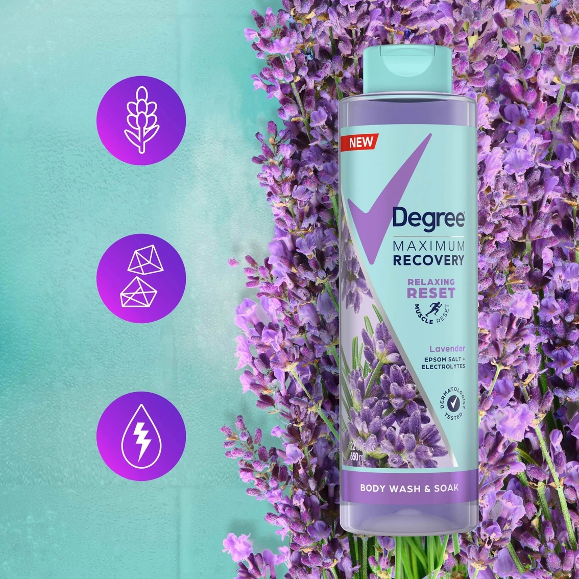 After putting your body to work, give it the recovery it deserves, starting with your post-workout shower. Specially formulated for active people, Degree Maximum Recovery Lavender Body Wash and Soak works with the power of hot water in your shower to help you reset your muscles and tackle total body recovery with every shower. With Epsom Salt, Electrolytes and Lavender extract. Bath and body wash features mood-boosting fragrance technology that delivers a soothing Lavender scent to your shower experience, helping you feel relaxed and prepared for whatever is next.